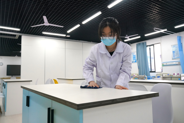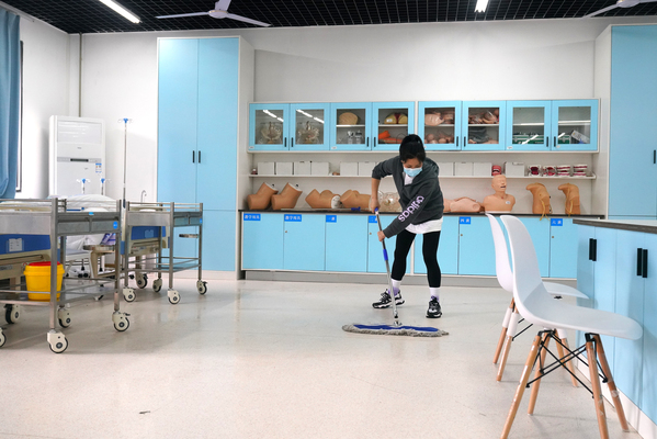 据了解,智慧康养学院共有实训室48间,面积约6600平方米。整顿过程中,大家分工明确,各司其责,有的用75%的酒精对实训器材等进行擦拭,有的认真清扫地面的灰尘,并将桌椅排放整齐并拉开距离,有的将实训床铺上的床单等全部清洗晾干......整顿后的实训室干净整洁,实训器材摆放整齐,整个实训环境面貌焕然一新。