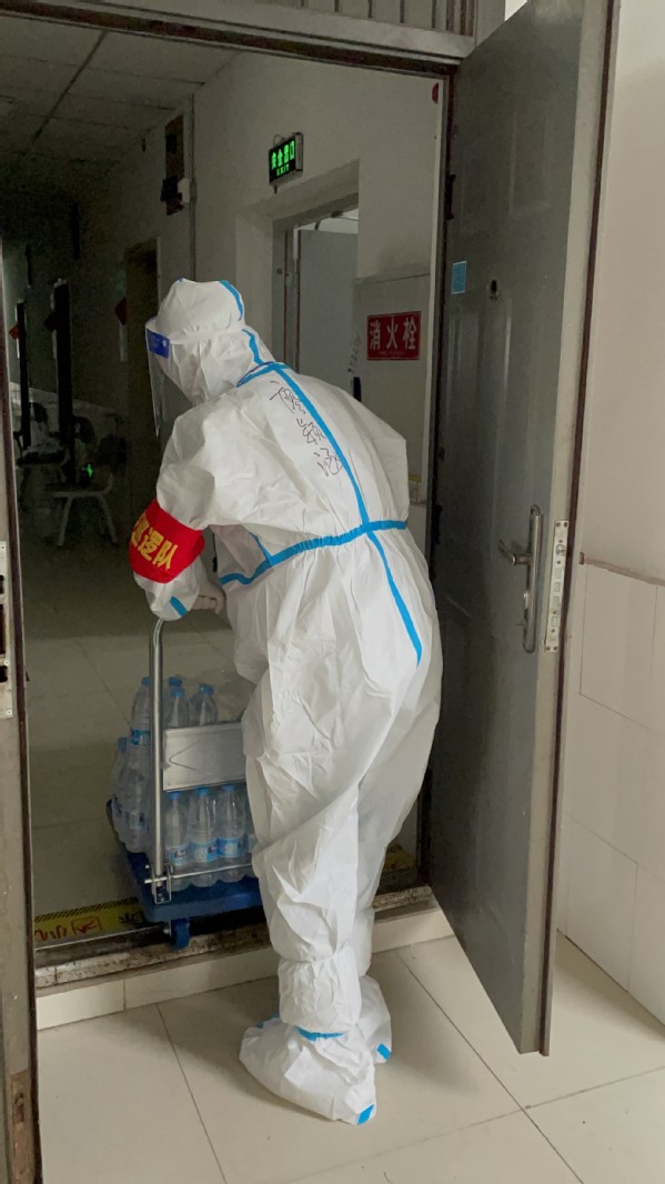 3月15日,得知入驻教师紧缺,正在运送物资的何娇毫不犹豫地报名进驻学生宿舍为学生服务。