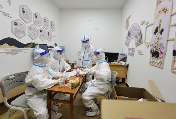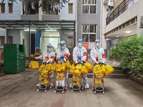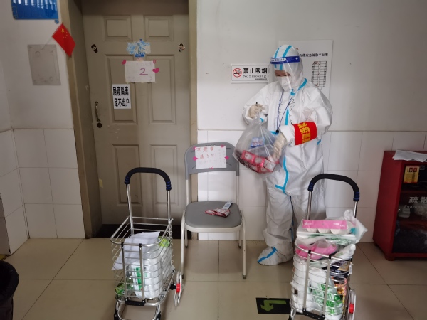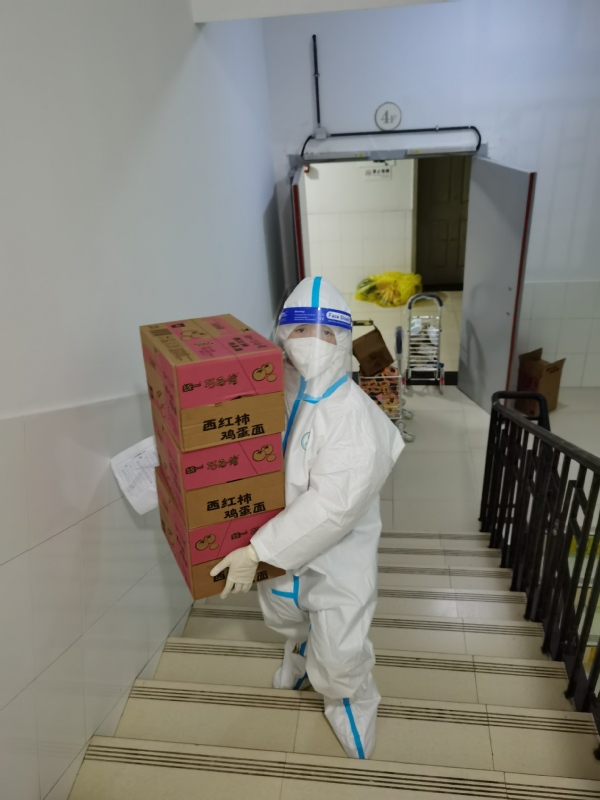 3月中旬,正是闷热难耐的时候。为了防止交叉感染,送餐组必须着全套防护设备,而且成员固定,不能轮换。当时,通识教育学院教师陆续接到“校外隔离”的通知,人力十分紧张,这时廖颖涵主动要求留在送餐组,与另外五名男教师一起,承担起为1200多人送餐的任务。每餐送完,她都瘫坐在阶梯上,但从不抱怨,仍旧积极乐观地为大家打气,连同行男教师都对她竖起大拇指。
