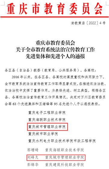 3月31日,重庆市教育委员会下发《关于全市教育系统法治宣传教育工作先进集体和先进个人的通报》,我校荣获重庆市教育系统法治宣传教育工作先进集体,机关党总支书记、党委宣传网工部副部长刘峰久荣获重庆市教育系统法治宣传教育工作先进个人。