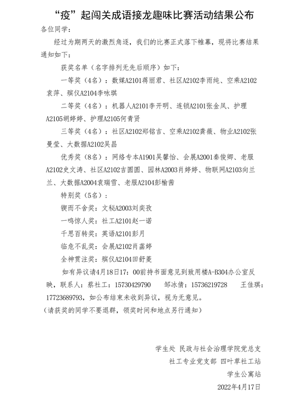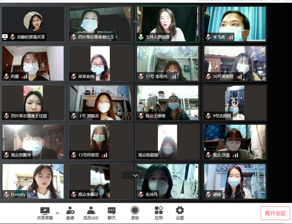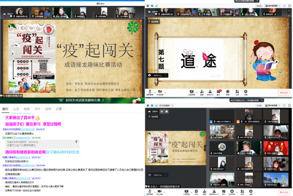 “请问第3组20位选手做好准备了吗?准备好了的在留言区扣1”“请2号选手接龙,诚心诚意”“倒计时5、4、3”……为丰富我校健康监测学生抗疫期间精神文化生活,4月16日-17日,由学生处、民政与社会治理学院党总支主办,社工专业党支部、四叶草社工站、学生公寓社工站联合承办的“疫”起闯关成语接龙趣味比赛在腾讯会议线上举行。民政与社会治理学院党总支书记陶军屹,副院长、社工专业党支部书记李飞虎,通识教育学院人文素质教育教研室主任、文化学学科带头人冯雪燕以及300余名同学参加了本次活动。