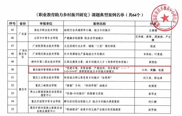 近日,根据教育部职业技术教育中心研究所发布的《关于入选“职业教育助力乡村振兴”课题典型案例结果的通知》,我校《党建引领、资智助推、产教协同、项目帮扶——1+2+3+4+N高职院校助力乡村振兴新模式》入选课题典型案例。