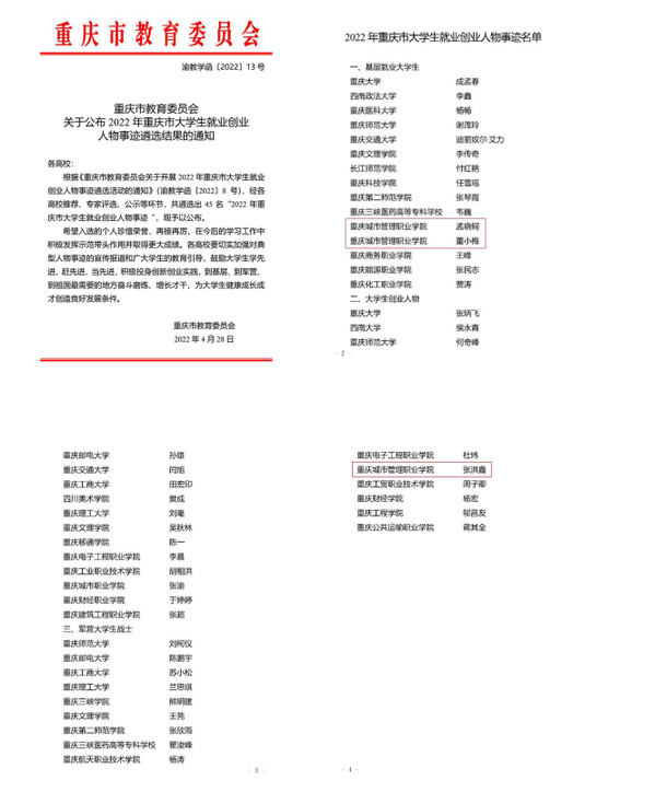 4月28日,重庆市大学生就业创业人物事迹遴选结果公布,根据《重庆市教育委员会关于公布2022年重庆市大学生就业创业人物事迹遴选结果的通知》(渝教学函〔2022〕13号),共遴选出“2022年重庆市大学生就业创业人物事迹”45名。其中,我校社区管理与服务专业孟晓轲、商务英语专业学生董小梅被评为“基层就业大学生”,社区管理与服务专业张洪鑫被评为“军营大学生战士”。