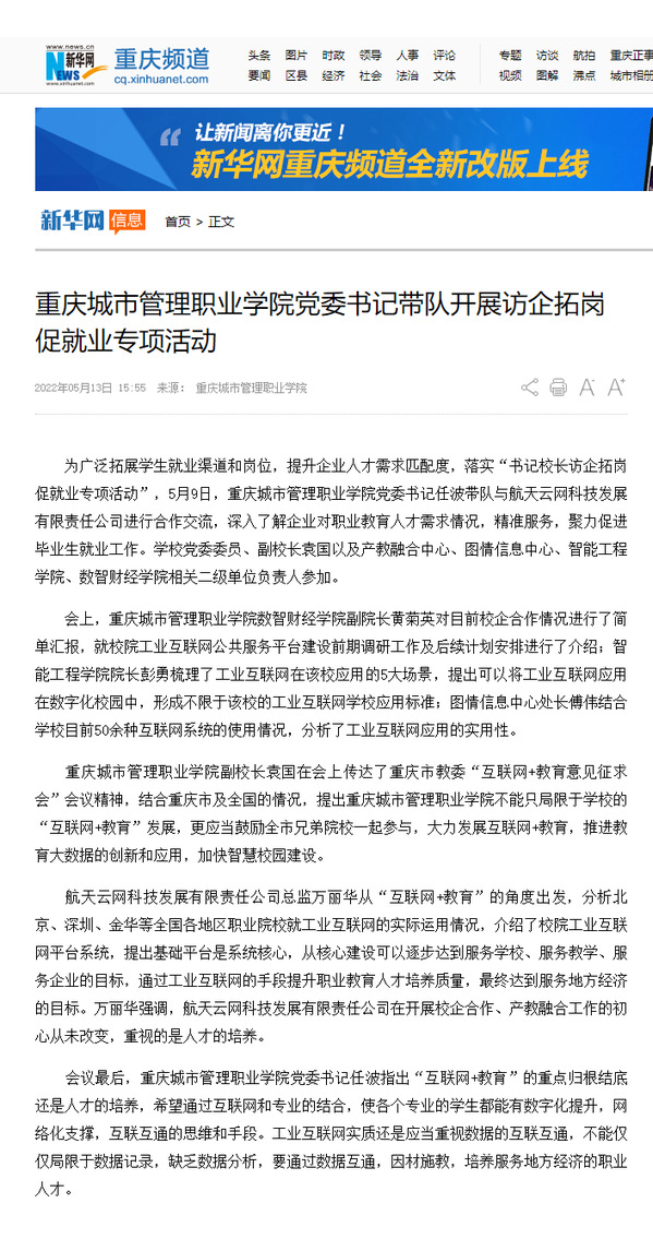 作者:产教融合中心、党委宣传网工部审核发布:重庆城市管理职业学院发布者:党委宣传网工部发布时间:2022-05-13浏览次数:117