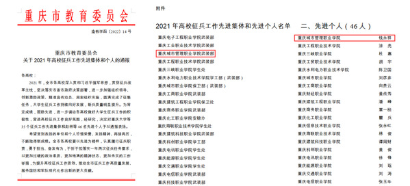 近日,重庆市教育委员会对全市优秀征兵工作单位予以通报表扬。我校党委武装部荣获“2021年高校征兵工作先进集体”荣誉称号。专武干事钱永祥同志被评为“2021年高校征兵工作先进个人”。学校征兵工作得到高度肯定。