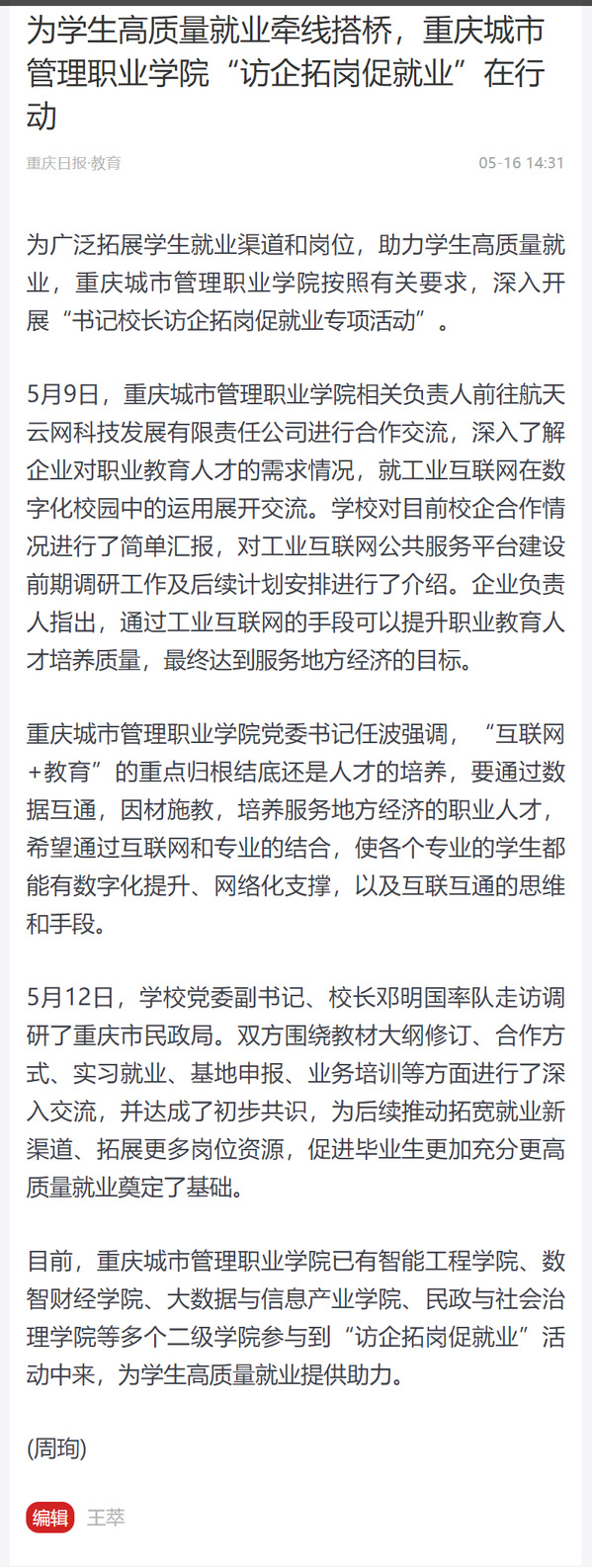 作者:党委宣传网工部审核发布:重庆城市管理职业学院发布者:党委宣传网工部发布时间:2022-05-16浏览次数:295