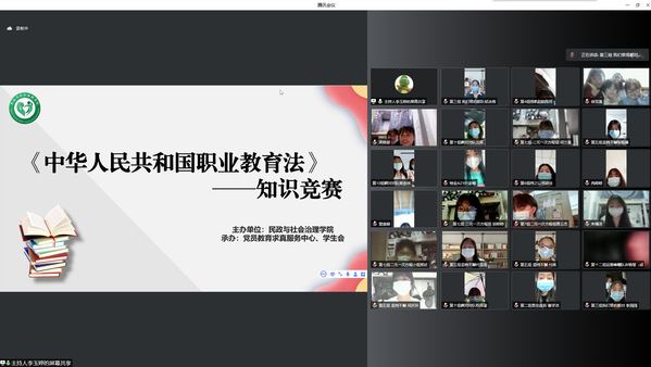 为深入学习贯彻习近平总书记对职业教育的重要指示和全国职教大会精神,提高同学们对新颁布的《职业教育法》的学习热情,增强同学们对职业教育的认同感和获得感,5月18日,民政与社会治理学院在线上组织开展《职业教育法》知识竞赛。民政与社会治理学院党总支副书记李国英,辅导员李萍、伍思蔓,民政与社会治理学院党员教育求真服务中心、学生会全体学生干部以及60名参赛选手参加此次活动。