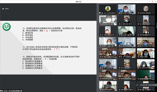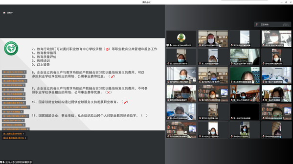 在主持人宣布线上知识竞赛开始后,各组参赛选手踊跃参加,活动气氛热烈有序。本次竞赛的题目中囊括了《职业教育法》各方面的问题,通过必答题、轮答题、抢答题的形式展现给同学们。必答题环节,直接将参赛选手充足的知识储备能力展示的一览无余;“恭喜,回答正确!”“第三组小队回答正确!”.......各组参赛选手的轮流回答犹如细水长流,竞赛逐渐白热化;在抢答环节中,更是在主持人刚下达指令之时,参赛选手们就争先恐后的“举手”回答,一度将竞赛推向最高潮。在激烈的比拼当中,第三组获得了本次《职业教育法》知识竞赛一等奖;第四组和第六组获得二等奖;第五组、第九组、第十组和第十二组获得三等奖。