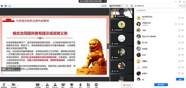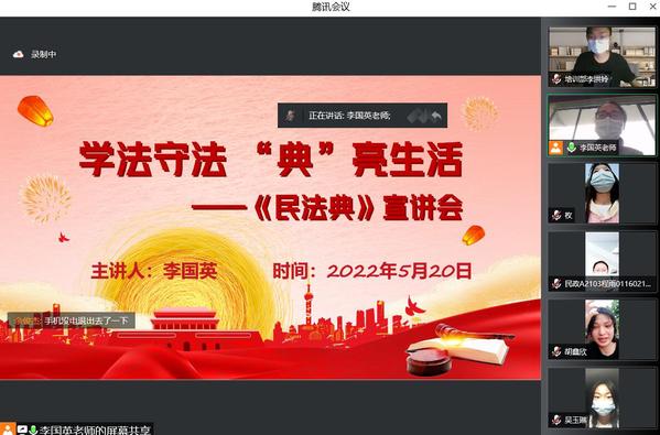 为进一步提高大学生的法律意识和法治观念,弘扬社会主义法治精神,提高学生的自我保护能力、提升法律素养,营造尊法学法守法用法的浓厚氛围,5月23日,民政与社会治理学院在线上组织开展学法守法·“典”亮生活—《民法典》主题宣讲会。民政与社会治理学院党总支副书记李国英以及民政与社会治理学院200余名学生干部参与此次宣讲会。