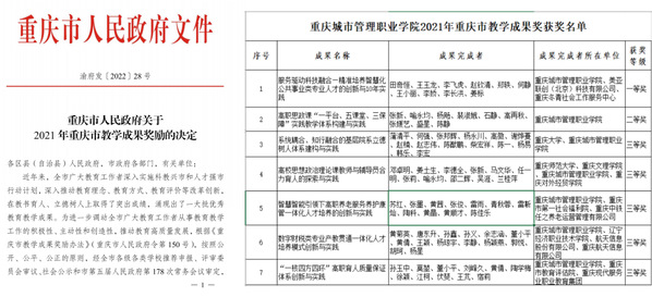 近日,重庆市人民政府公布了2021年重庆市教学成果奖获奖名单。高等教育共评选出211项教学成果奖,我校喜获7项。其中,一等奖1项、二等奖1项、三等奖5项。