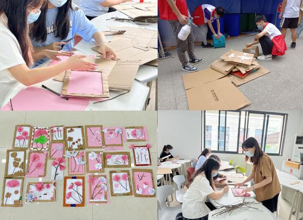在智能工程学院学生会干部的带领下,志愿者们首先到学校快递站将废纸箱进行二次消毒。前期准备就绪后,在致用楼B410教室举行了“环保手工变废为宝 携手共建文明校园”文明风采实践活动。白鹿创意工艺社成员张倩、王洪平等同学对本次手工作品进行了耐心细致地指导,同学们结合自己的创意制作出了“五月的鲜花”系列手工艺作品。