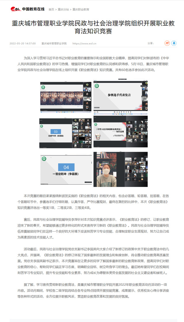 作者:民政与社会治理学院审核发布:重庆城市管理职业学院发布者:党委宣传网工部发布时间:2022-05-20浏览次数:187