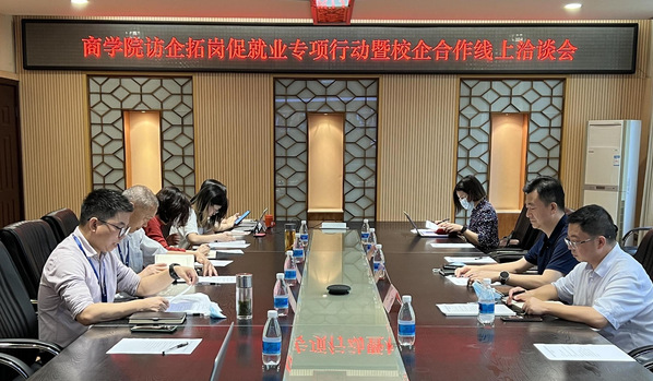 为扎实开展高校书记校长“访企拓岗促就业”专项行动,加强与校企合作单位的交流,全力确保2022届毕业生充分就业,6月2日,商学院在行政楼第三会议室召开“访企拓岗促就业”专项行动暨校企合作线上洽谈会。学校党委委员、副校长袁国,学校产教融合中心、就业指导中心相关负责同志,商学院党政负责同志及各专业带头人、教研室主任等参加会议。会议由商学院副院长邱云主持。