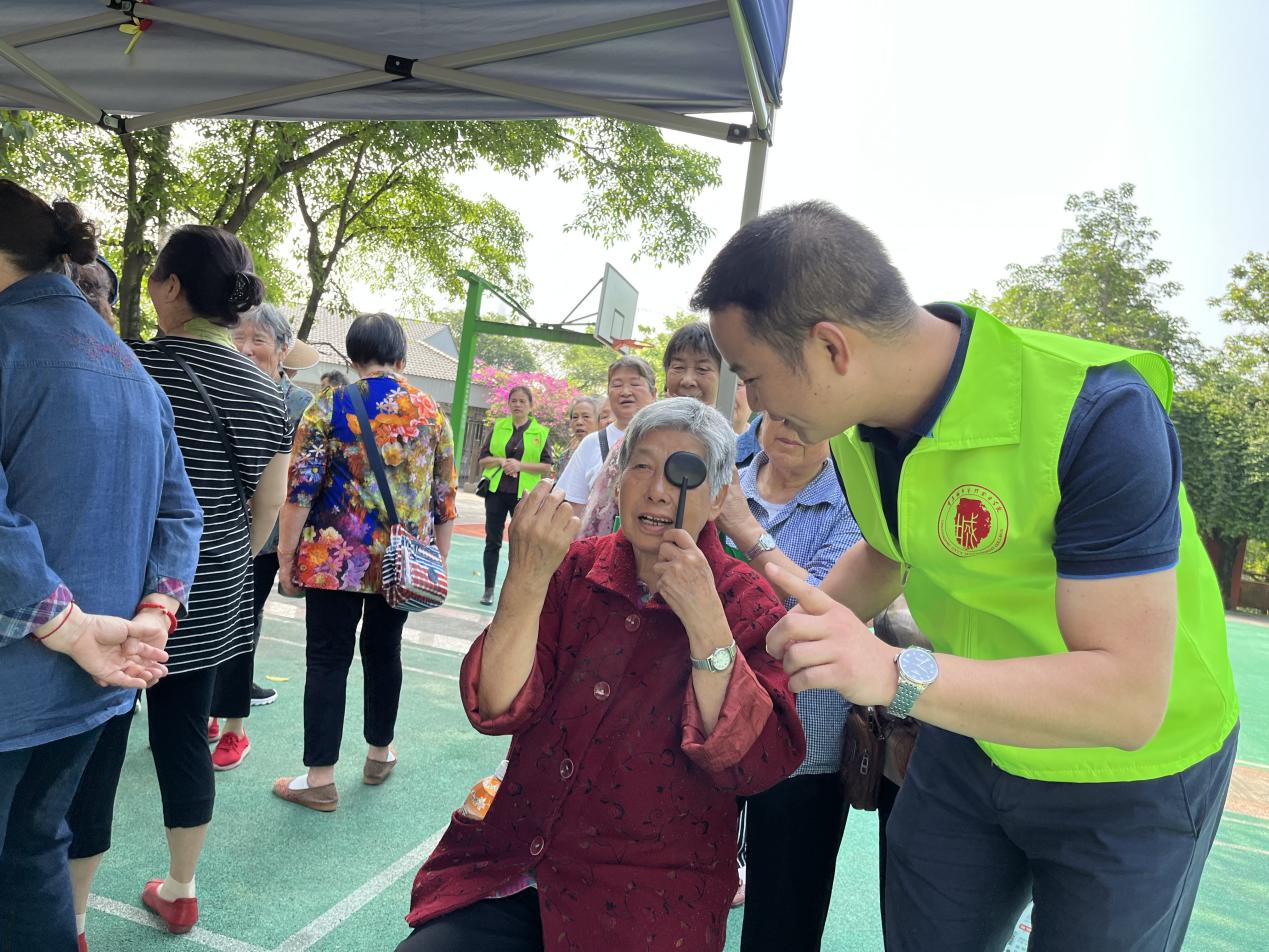 宣传现场,有的志愿者穿梭在排队的人群中,通过发放宣传手册向社区居民宣传健康方式;有的志愿者为现场居民提供流程指引、暖心遮阳等服务;有的志愿者为在场的社区老人进行了测血糖、眼部检查和健康档案建立等检测项目;还有的志愿者针对白内障、近视眼、糖尿病、慢性病等相关疾病进行健康宣传和义诊活动。志愿者认真、细致、专业的态度获得社区工作人员和现场居民的一致好评。