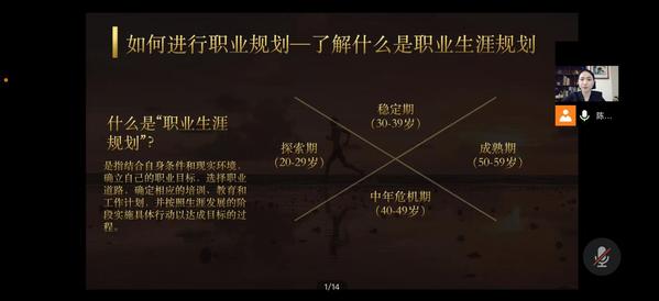本次讲座围绕“如何做好个人的职业规划”主题进行阐述。陈思婷学姐通过从个人职业生涯分享、学生角色如何转换、如何进行职业规划、适应社会迈向职场四大方面对“如何赢在职场起跑线”进行讲解。之后,康倩楠学姐提出学习创造价值、价值创造金钱、金钱创造财富等观点。两位校友以其丰富的成长经历为同学们带来了许多关于择业就业、职业规划、创新创业等方面的中肯建议,让同学们受益匪浅。