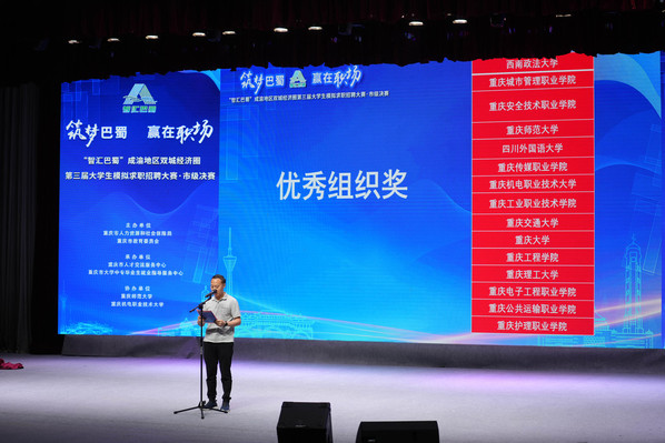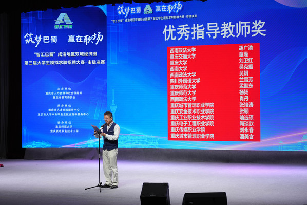 6月10日,“智汇巴蜀”成渝地区双城经济圈第三届大学生模拟求职招聘大赛重庆片区决赛在重庆师范大学校友会堂举行。经过激烈角逐,我校张蕊同学以92.18的全场最高分获得专科组一等奖,丁瑞麒获得二等奖,张培涛、潘美含老师获得优秀指导教师奖,学校获得优秀组织奖。
