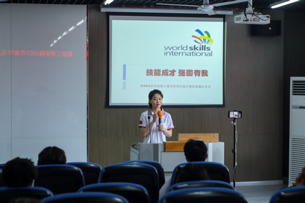 从“插班生”到为国出征,梁英英分享了她的大学生活和备赛经历,通过参加各种丰富多彩的活动结识了职业生涯的启蒙老师;抱着对美容、美体、化妆、美甲技术的好奇,开始了她美容项目的集训生活。“没有目标,没有激情,就没有努力的动力和方向”梁英英清楚自己内心的渴望,那就是对技能的极致追求。备赛的过程残酷且艰辛,思想松懈、行为懒散是致命的,只有不轻言放弃,坚持到底才有希望。回忆起彼时备赛中的各种艰辛和感动,梁英英热泪盈眶,她告诉自己:“我要做个‘不倒翁’,坚忍不拔、永不倒下”。面对困难,她始终坚信奋起直追一切皆有可能。与会师生认真聆听,用心感受梁英英老师不凡的技能夺冠之路和心路成长历程。