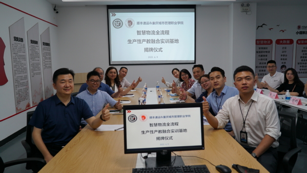 近日,商学院举办智慧物流全流程产教融合生产性实训基地揭牌仪式。顺丰集团深圳总部人才生态与供应链处负责人徐晨、大学生项目负责人朱茜,丰学项目组校园负责人唐惠铭,顺丰速运重庆有限公司人力资源总监王自鹏,学校副校长袁国、商学院副院长邱云,顺丰人资相关骨干人员,物流管理专业、物流工程专业教师代表出席仪式。