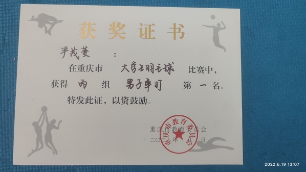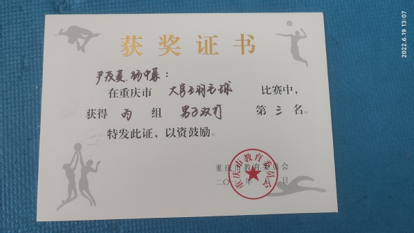 6月15—19日,重庆市教育委员会主办的“2022重庆市大学生羽毛球比赛”在重庆交通大学科学城校区举行。来自重庆市50所高校622名队员参加比赛。经过角逐,我校代表队最终获得专业组男子单打第一名、双打第三名的优异成绩。