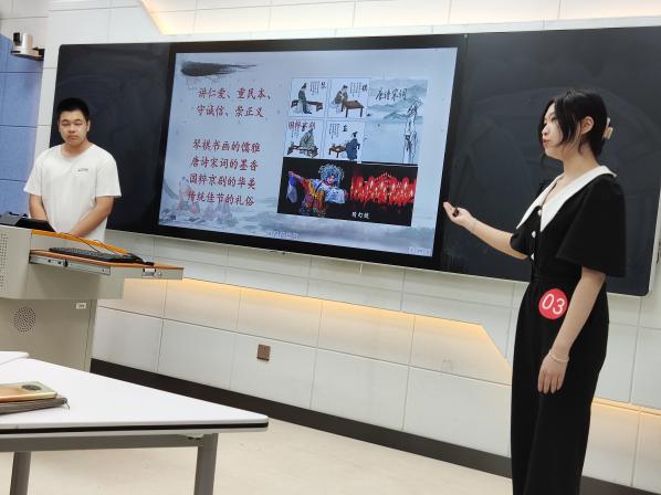 为深入贯彻落实习近平总书记关于“大思政课”建设的重要论述精神,充分发挥高校思政课立德树人关键课程作用,坚持不懈用习近平新时代中国特色社会主义思想铸魂育人,展现新时代我校大学生的马克思主义理论素养和精神风貌,6月23日,马克思主义学院在敏学楼智慧教室举办了我校大学生讲思政课公开课展示活动。学校党委组织部部长付海涛、招生处处长徐颖、继续教育学院院长陈娜应邀担任此次展示活动嘉宾评委。马克思主义学院院长杨飏、副院长张媛艺以及学院相关指导老师出席此次展示活动。