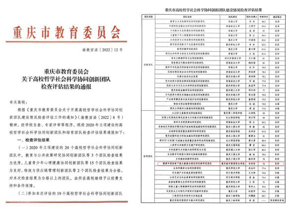 近日,重庆市高校哲学社会科学协同创新团队检查评估结果公布。我校田奇恒教授作为带头人于2020年获批培育的《健康中国战略下城乡健康治理协同创新研究团队》以“良好”等级通过检查评估,并被正式命名为重庆市高校哲学社会科学协同创新团队。