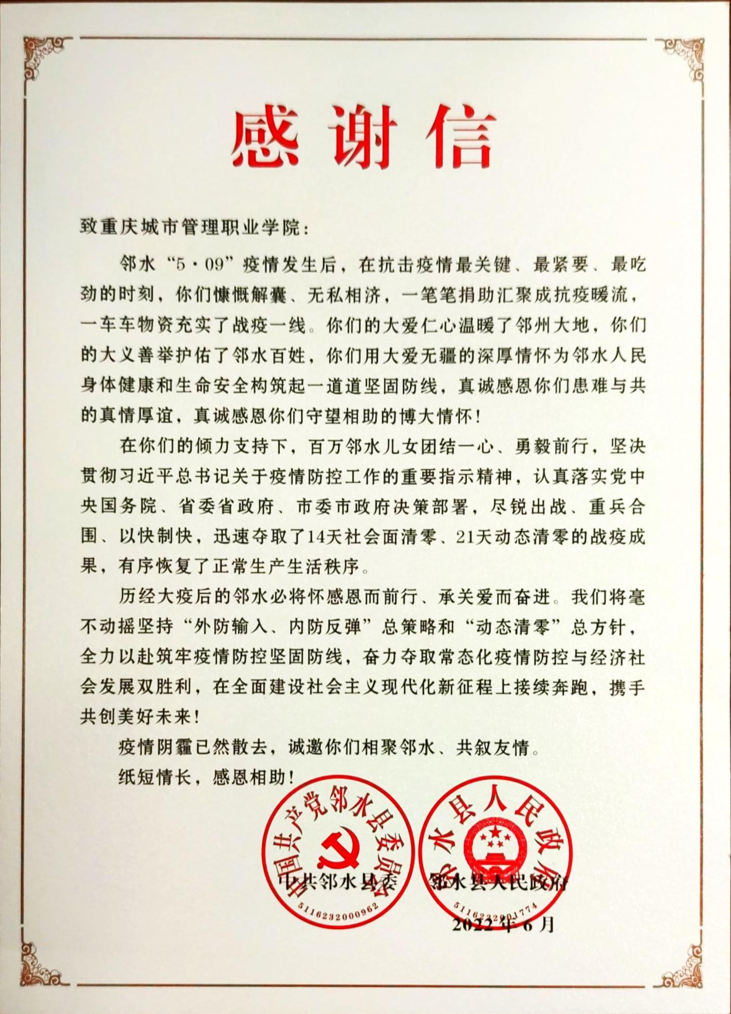 近日,邻水县委、县政府发来感谢信,感谢我校为邻水县疫情防控工作捐赠疫情防控物资。
