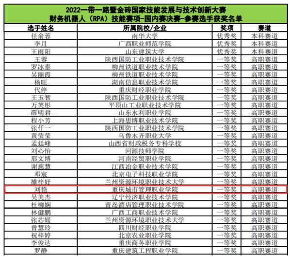 7月30日,“2022一带一路暨金砖国家技能发展与技术创新大赛”财务机器人(RPA)技能竞赛项目国内总决赛收官。在我校数智财经学院黄菊英副院长携手领导班子的领导下,由阳勇、王谦老师指导的大数据与会计专业学生刘艳同学以全国第18名的成绩从339名高职赛道决赛选手中脱颖而出,荣获全国一等奖,顺利取得财务机器人(RPA)技能竞赛国际赛的参赛资格。
