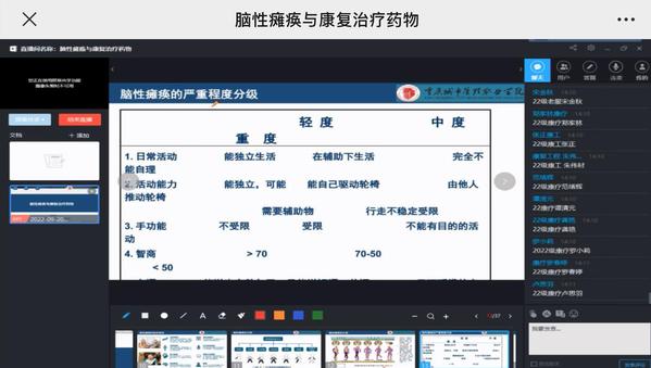 曾凡新博士首先为全校师生作了题为《脑性瘫痪与康复治疗药物》的主题讲座。曾凡新博士为药理学博士、正高级工程师、重庆市“鸿雁计划”B类引进人才、重庆市英才计划创新创业团队负责人、重庆市两江新区2019智汇两江科技领军人才、西部科学城(重庆)金凤凰领军人才。讲座中,他主要从脑性瘫痪的流行病学及病因、脑性瘫痪的临床表现与诊断、脑性瘫痪康复的治疗药物选择三个方面向全校师生科普了脑性瘫痪的发病原因、临床表现与诊断及康复治疗药物等。