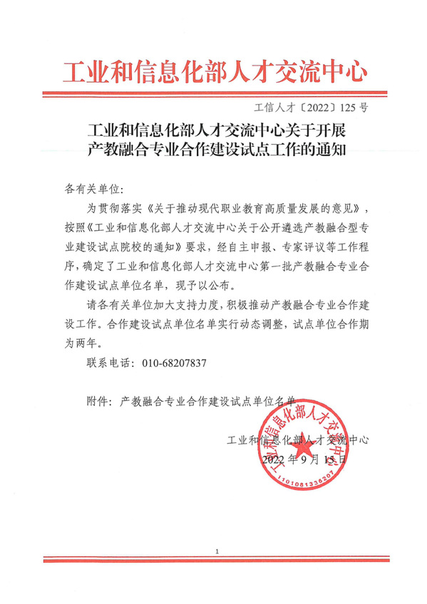 9月15日,工业和信息化部人才交流中心公布工业和信息化部人才交流中心第一批产教融合专业合作建设试点单位名单。我校入选第一批产教融合专业合作建设试点单位,工业机器人技术专业入选第一批产教融合型专业。
