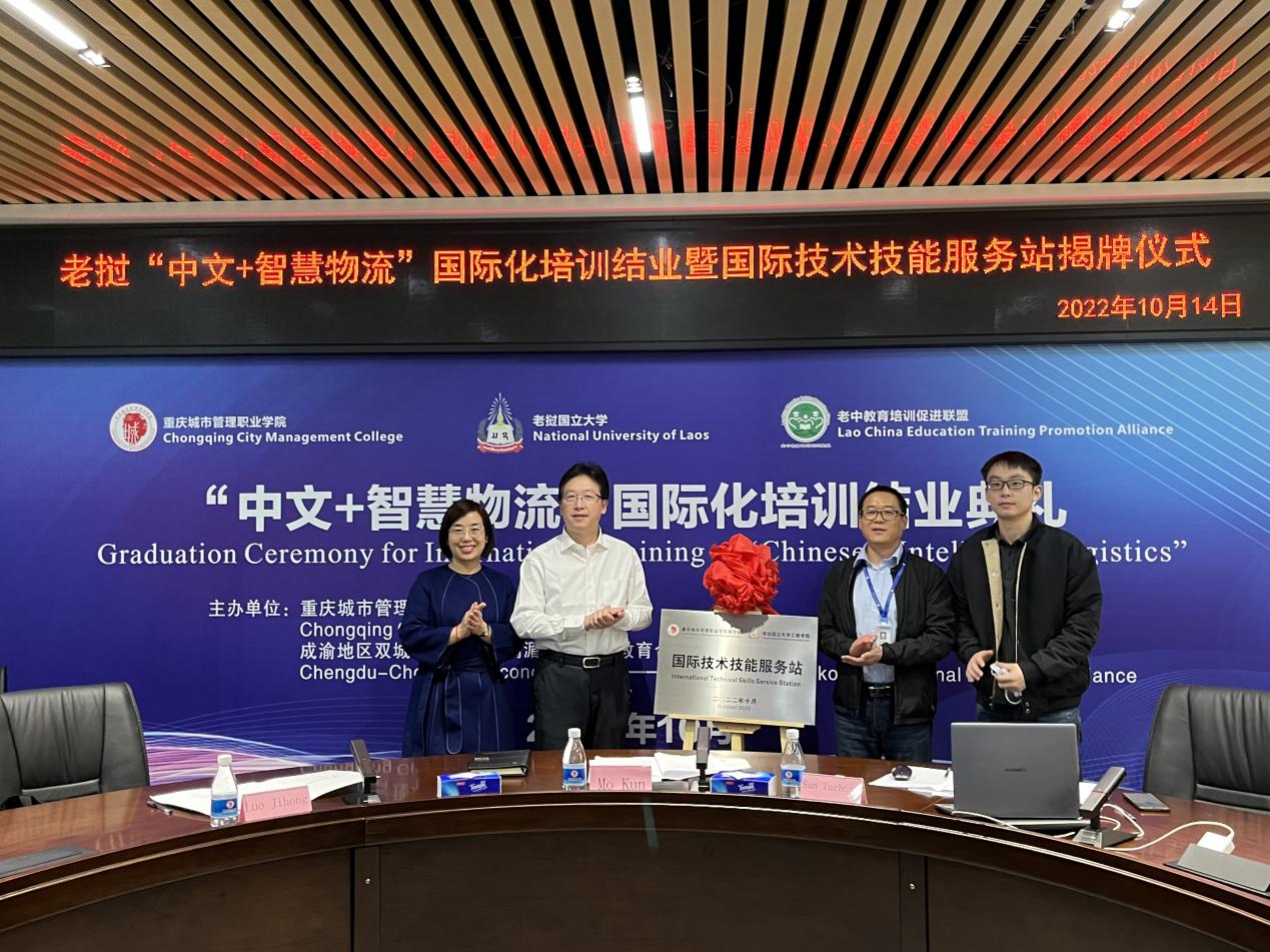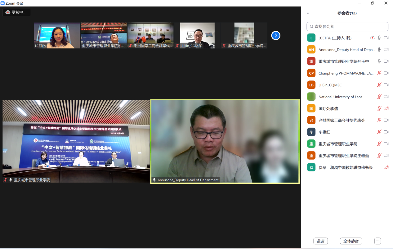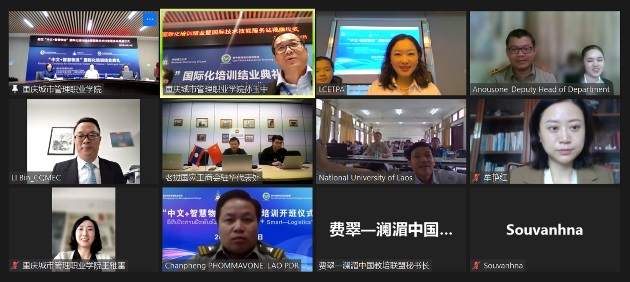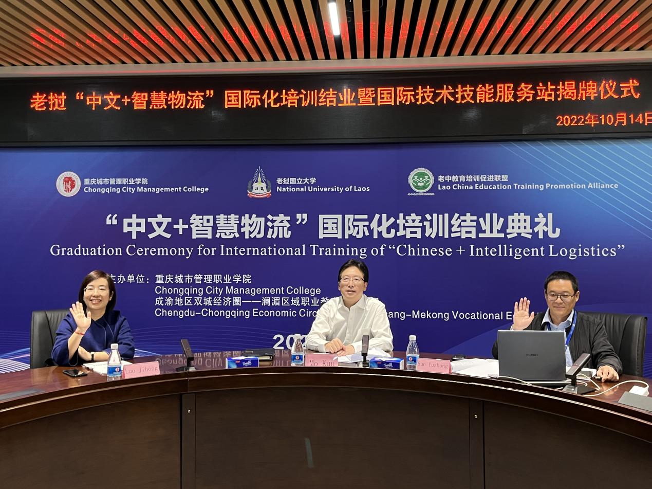 10月14日,我校与老中教育培训促进联盟面向老挝国立大学学生联合培养的“中文+智慧物流”线上国际化培训圆满结业。重庆市教育委员会国际合作与交流处处长李斌,学校副校长莫堃,老挝公共工程与交通部行政及人力资源司副司长帕旺苏克·苏纳班迪出席结业典礼。典礼由学校国际合作与交流中心主任孙玉中主持。