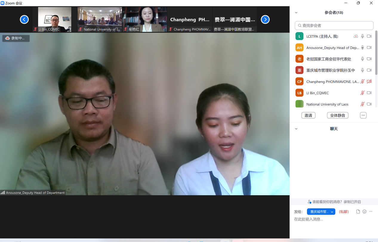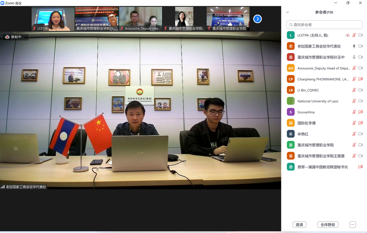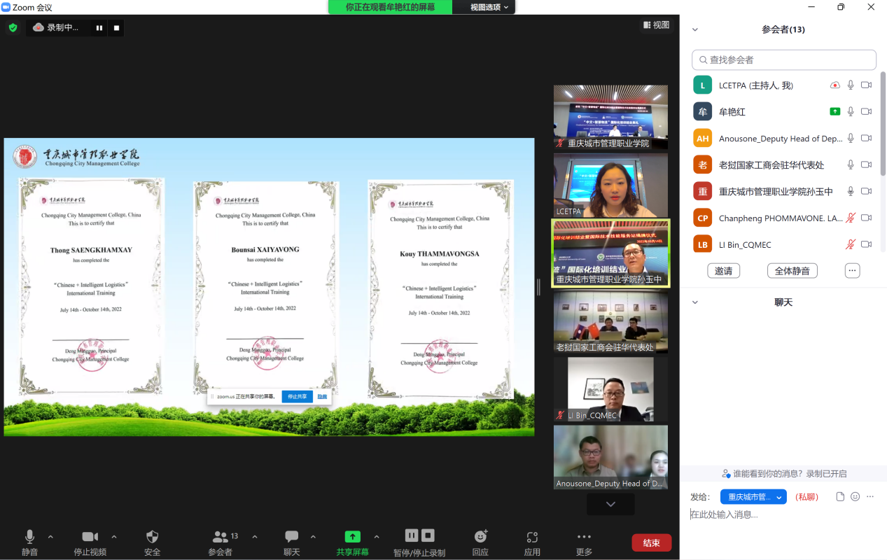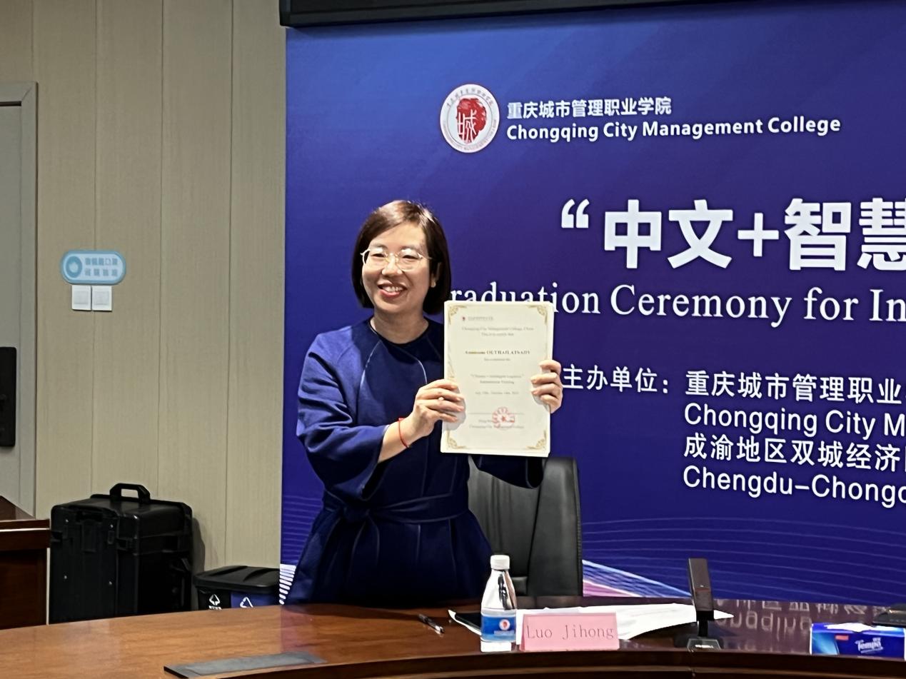 10月14日,我校与老中教育培训促进联盟面向老挝国立大学学生联合培养的“中文+智慧物流”线上国际化培训圆满结业。重庆市教育委员会国际合作与交流处处长李斌,学校副校长莫堃,老挝公共工程与交通部行政及人力资源司副司长帕旺苏克·苏纳班迪出席结业典礼。典礼由学校国际合作与交流中心主任孙玉中主持。