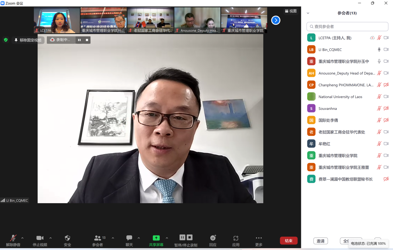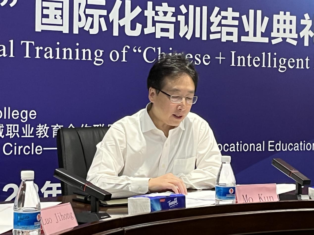 最后,李斌处长发表讲话。他表示培训项目的圆满结束,既是对前期项目开展情况的总结,也是中老校企四方深化合作的新起点。希望学校作为成渝地区双城经济圈-澜湄区域职业教育合作联盟理事长单位密切对接老挝企业行业企业需求,协同做好联盟国际化人才联合培养,形成成渝地区职业教育“走出去”品牌。