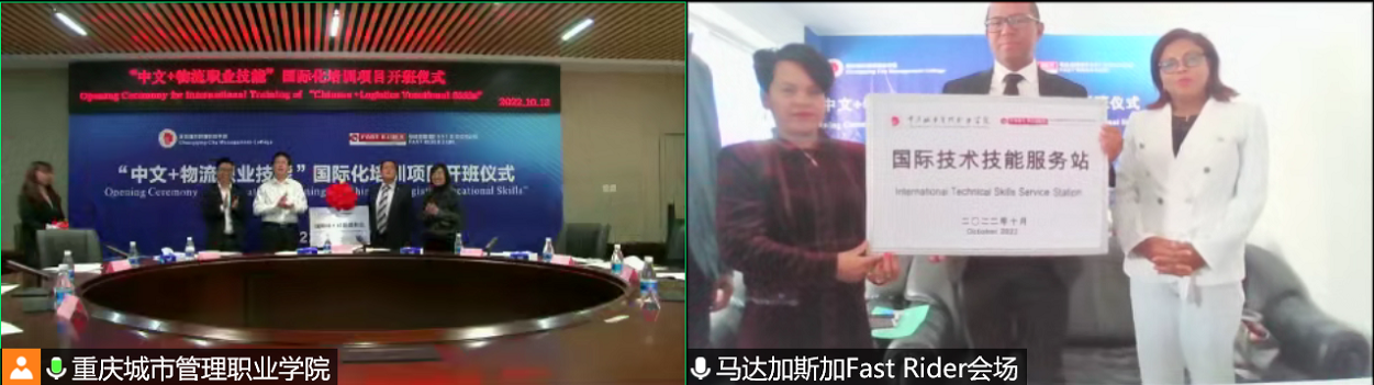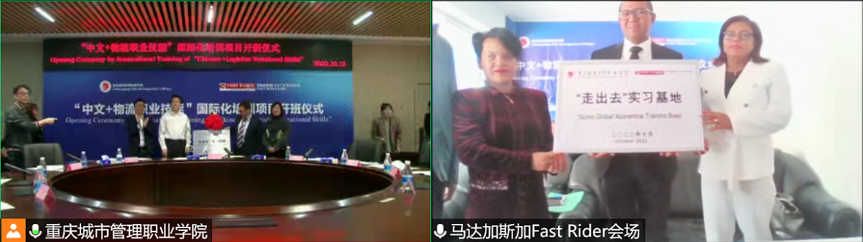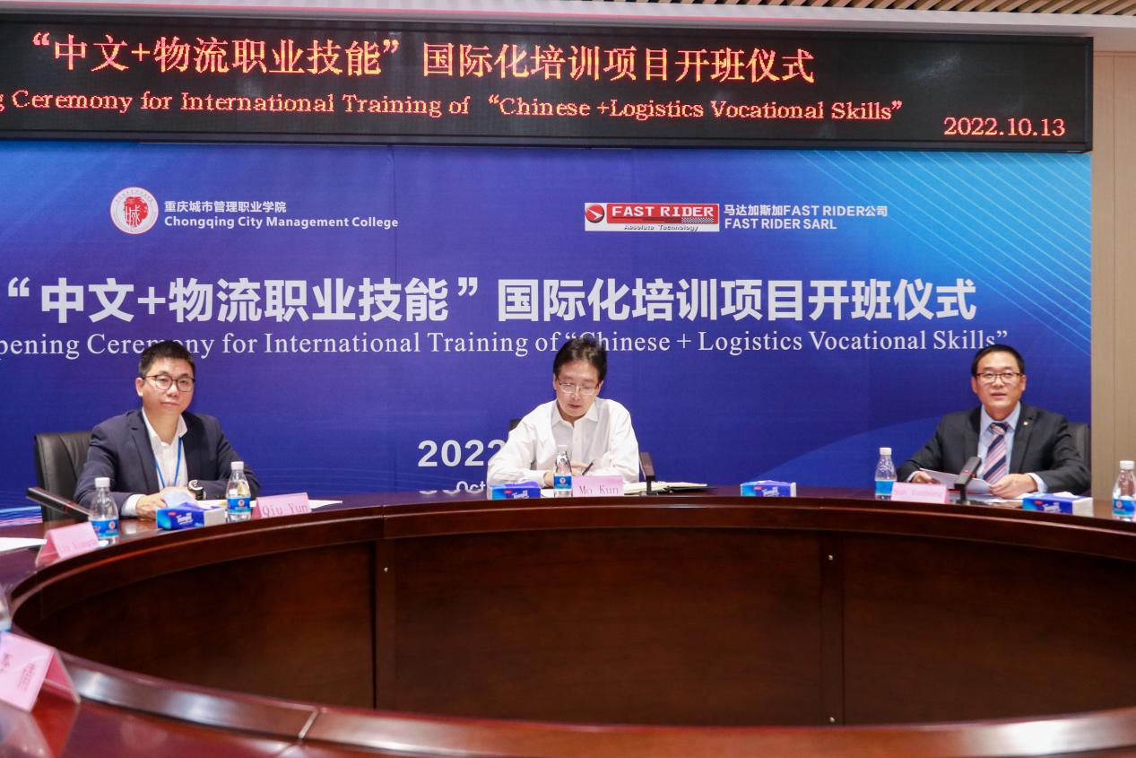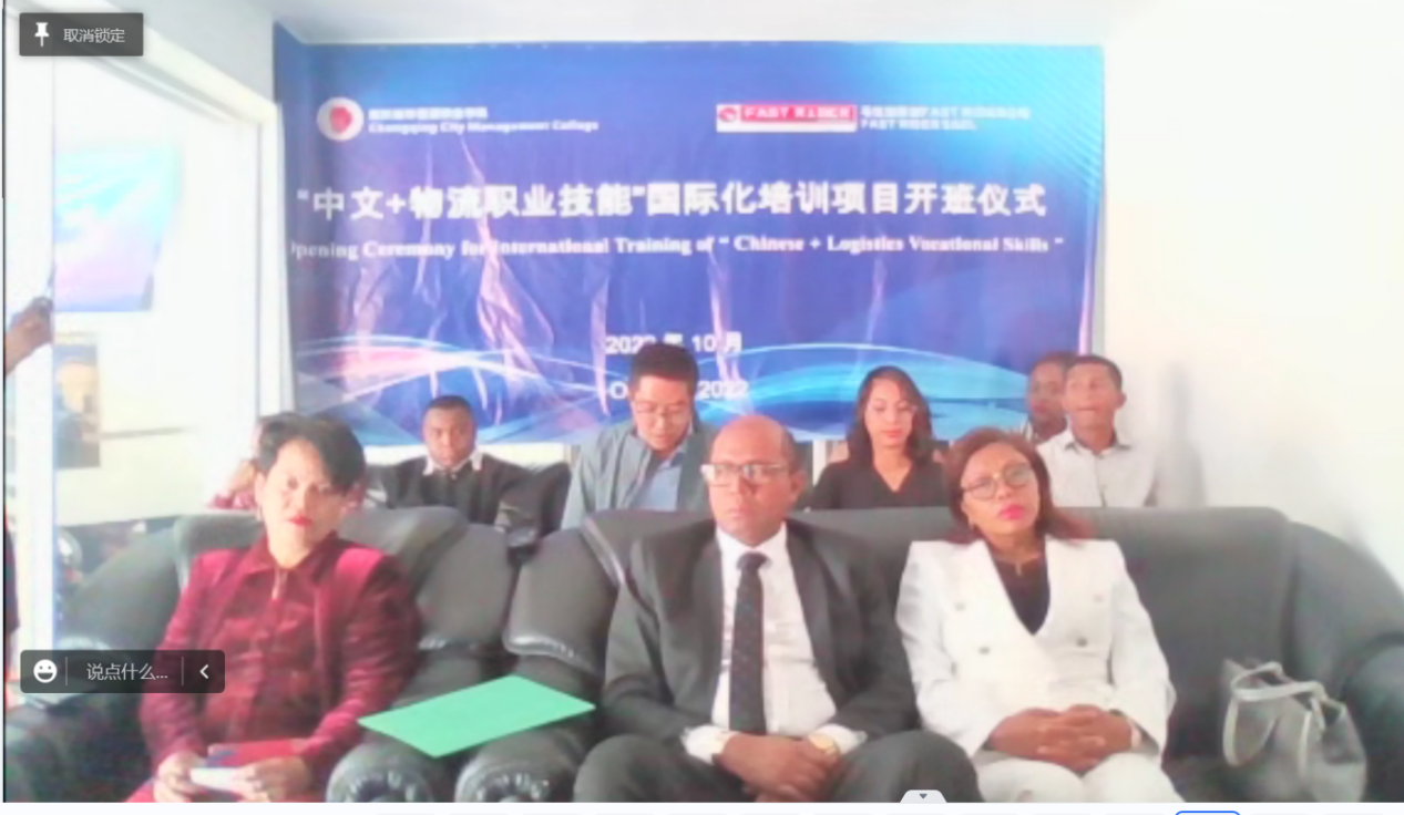 10月13日,由我校与马达加斯加FAST RIDER公司联合组织的“中文+物流职业技能”国际化培训项目顺利开班。重庆市教育委员会国际合作与交流处处长李斌、学校副校长莫堃、马达加斯加旅游部秘书长拉科托尼亚纳·伊夫·莫里斯、高等宪法法院高级顾问拉维罗哈尼特拉南波拉尼亚尼·安东尼娅、旅游部合作顾问拉索珑德拉伊贝·哈里索阿·尼里娜出席开班仪式。仪式由国际合作与交流中心主任孙玉中主持。