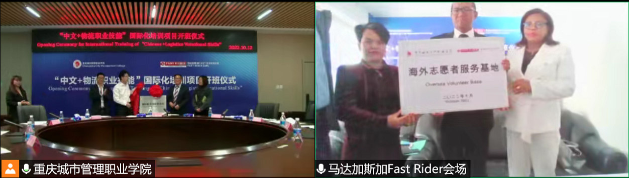 在基地共建仪式上,莫堃副校长与马达加斯加当地政府官员、孔子学院教师共同为我校马达加斯加国际技术技能服务站、“走出去”企业实习基地、海外志愿者服务基地进行揭牌。