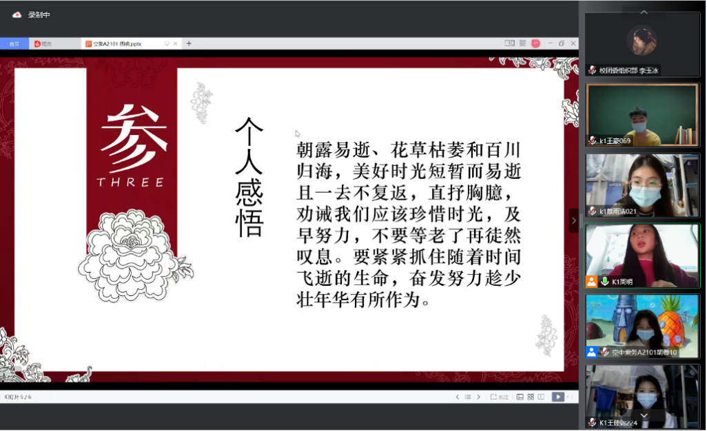 结合当前疫情防控要求,各团支部通过腾讯会议、QQ、微信等线上形式,以“青春向党 梦想起航”为主题,开展了“导航青春”“唱响青春”“文化浸润青春”等活动。在“导航青春--转变就业观念,提升就业能力,成就就业梦想”活动中,各团支部围绕就业思想引领、能力提升,以学习座谈、故事分享、征文演讲等多种形式宣讲大学生就业知识,全面落实共青团促进大学生就业行动。在“唱响青春--云合唱活动”中,各团支部通过线上形式“合唱”歌曲,用饱含青春热血的歌声展示新时代大学生的昂扬风貌,用歌声与行动践行“请党放心 强国有我”的青春誓言。“文化浸润青春”专题开展弘扬中华传统文化主题团日活动,各团支部以线上活动的形式开展成语接龙、诗词大会、读书分享会等青年学生喜闻乐见的趣味活动,敦促同学们在活动中学习、传承、弘扬中华优秀传统文化,凝聚民族文化传承的青春力量。
