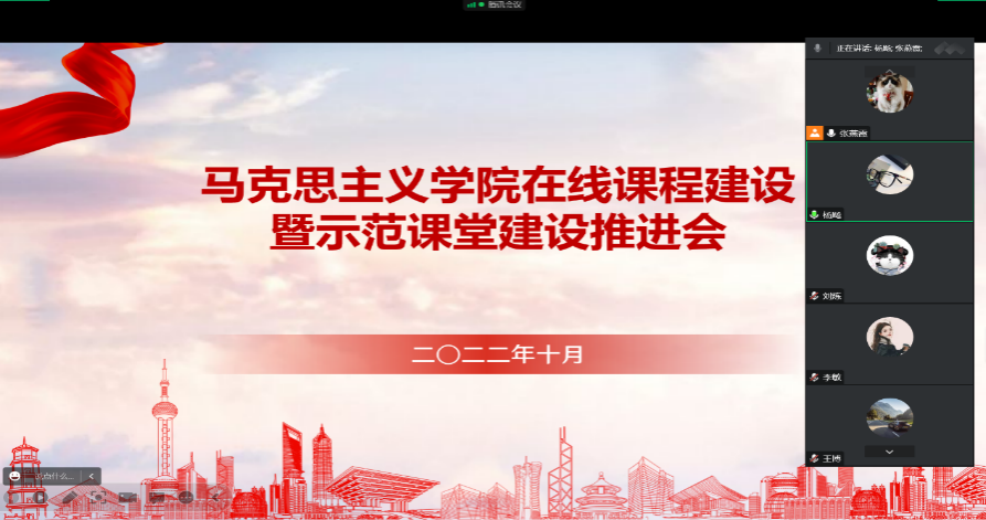 为深入学习贯彻习近平新时代中国特色社会主义思想,全面落实《关于加强新时代马克思主义学院建设的意见》《全面推进“大思政课”建设的工作方案》等文件要求,充分发挥思政课立德树人的关键作用,提升思政课建设质量,10月18日,马克思主义学院通过腾讯会议线上召开了在线课程建设暨示范课堂建设推进会。马克思主义学院院长杨飏、副院长张媛艺及各教研室主任参加本次会议。会议由杨飏主持。