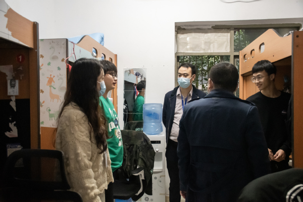 走访过程中,董勇、江茂森和辅导员们仔细查看寝室的各个角落、寝室门窗和整体卫生情况、寝室配电设施的规范管理,就寝室居住舒适度,寝室是否有漏水等问题与同学们进行了交流。董勇、江茂森提醒学生要注意做好防疫措施,带好口罩、注意个人卫生、寝室要常通风等,并及时关注班级群消息,做好每日晨晚检及核酸检测,若有异常情况要第一时间与辅导员取得联系。督促同学们要积极保持寝室卫生,共同努力营造良好的生活环境。江茂森不仅关切地询问了同学们的学习情况,还在交谈中积极为学生解答对于专业学习和未来职业选择上的疑问,要做好大学的人生规划,多参加社团活动和实践活动,同时他也提醒同学们要保障个人人身和财产安全,更好地投入到充实而有意义的大学生活。董勇强调,“学生的意见很重要,学生的事情无小事。以学生为本就要从关心学生的日常生活做起”。他叮嘱随行的辅导员,要尽力帮助学生解决生活中的困难,不断营造良好的学习生活环境。