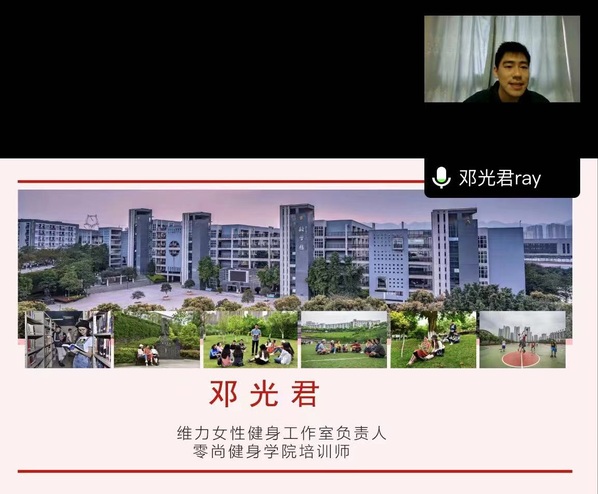推广健身健美,成就美好人生。社会体育2015级校友邓光君,现任维力女性健身工作室负责人,零尚健身学院培训师,2022年2月,荣获“巴渝青年技能之星”荣誉称号。他从专业认同、职业发展、对母校的归属感三个方面做了分享。邓光君重点结合当前的疫情,谈到康养事业的大好前途,以及自己经营的健身工作室的现状、前景,并讲述了我校“3·11”疫情时,他作为见证者、参与者,与我校师生封控在校园里同吃、同住,为学弟学妹送餐、送物的情景,他说,母校爱着每一名学生,老师们像战士一样冒着被感染的危险守护着这片校园,这令我很感动,我们也爱着自己的母校。