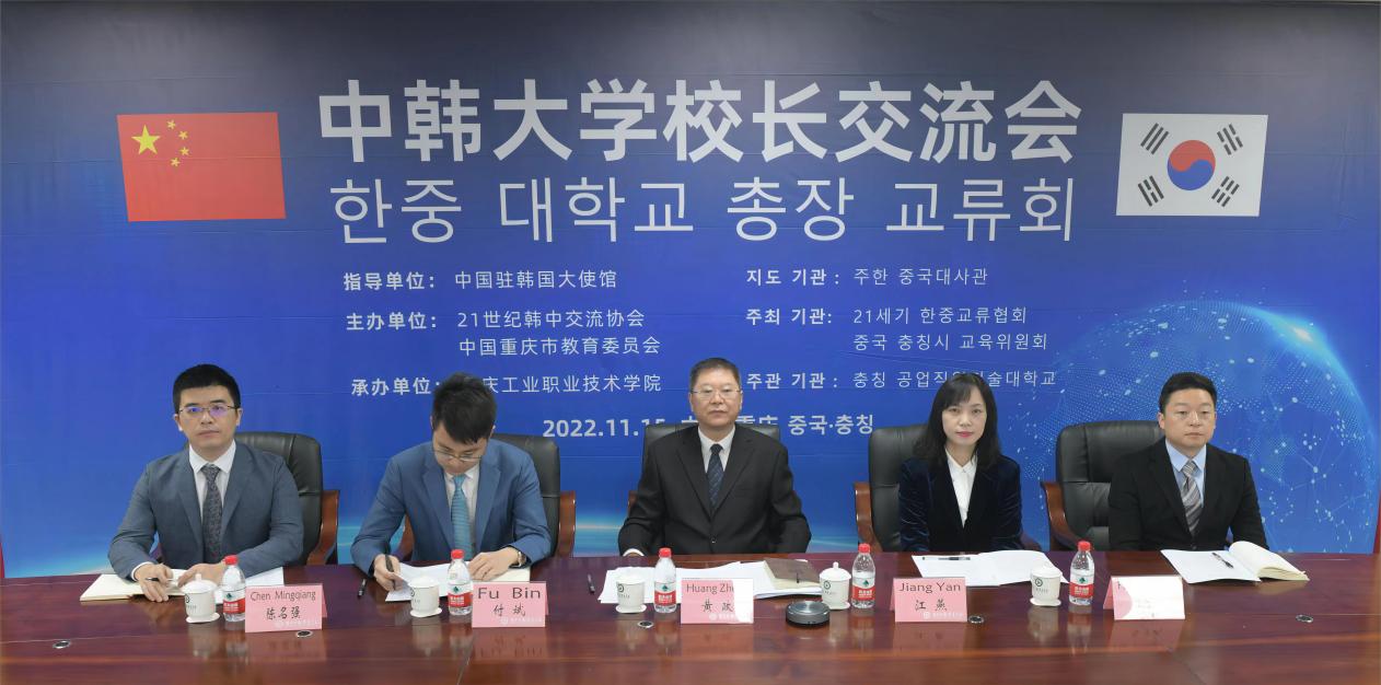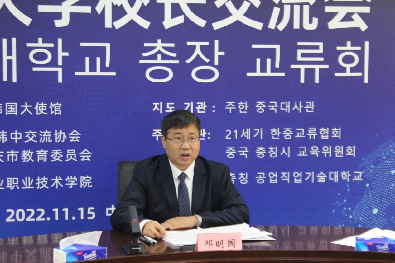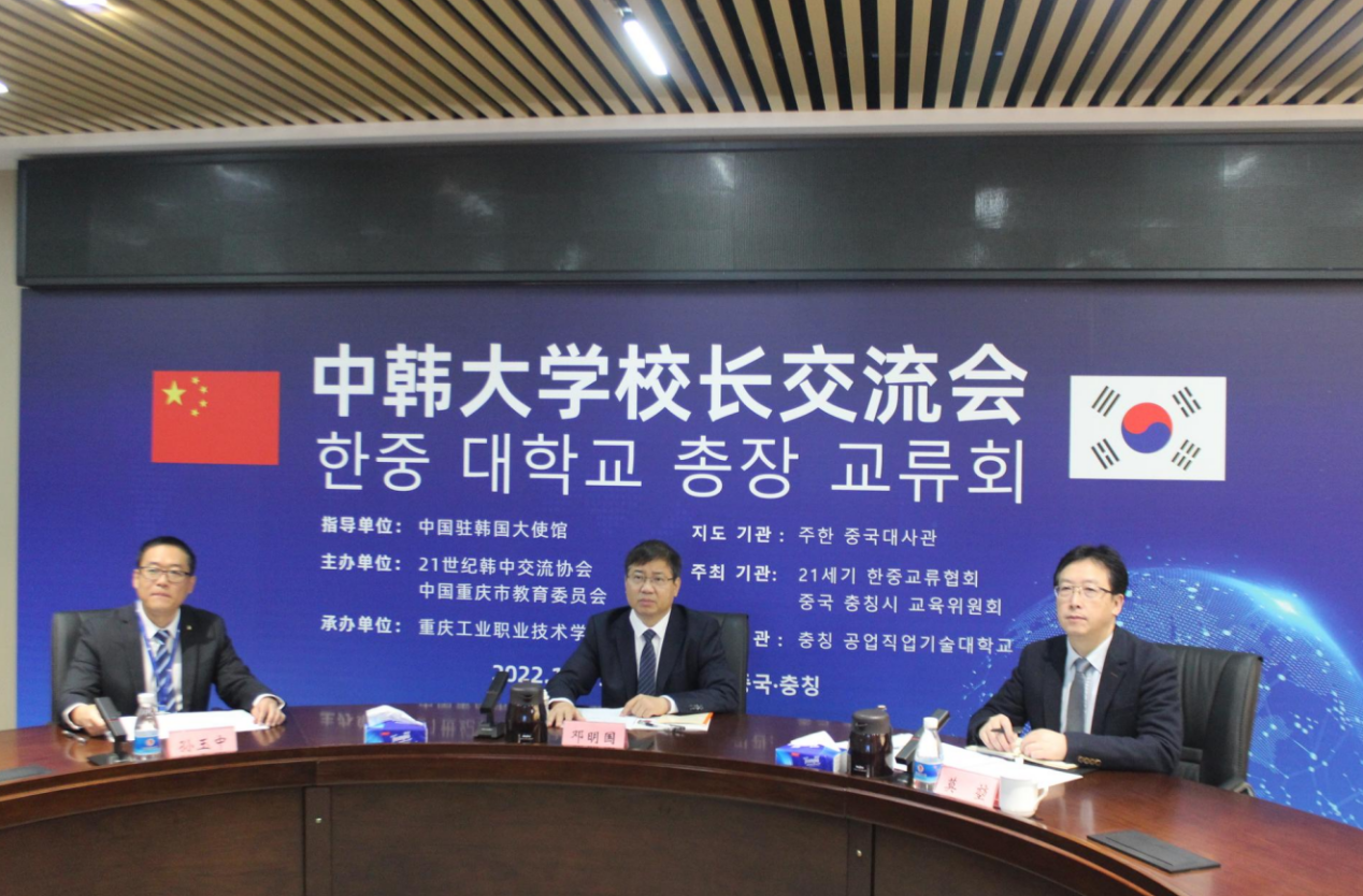 11月15日,由中国驻韩国大使馆指导支持,重庆市教育委员会和21世纪韩中交流协会共同主办的中韩大学校长交流会正式召开。中国驻韩国大使邢海明、公使衔参赞艾宏歌,韩国21世纪韩中交流协会会长金汉圭,重庆市委教育工委书记、市教委主任黄政出席并致辞。来自重庆13所高校和韩国5所高校的代表以线上线下相结合的方式参加了会议。我校校长邓明国、副校长莫堃以及国际合作与交流中心主任孙玉中应邀参会。