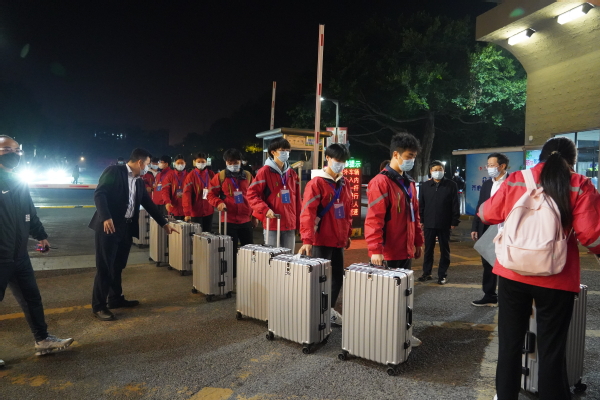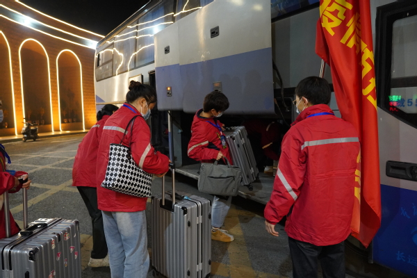 “出发!”在出征仪式结束后,志愿队全体师生立即乘坐专用车辆前往指定地点,为即将投入疫情防控工作作准备。