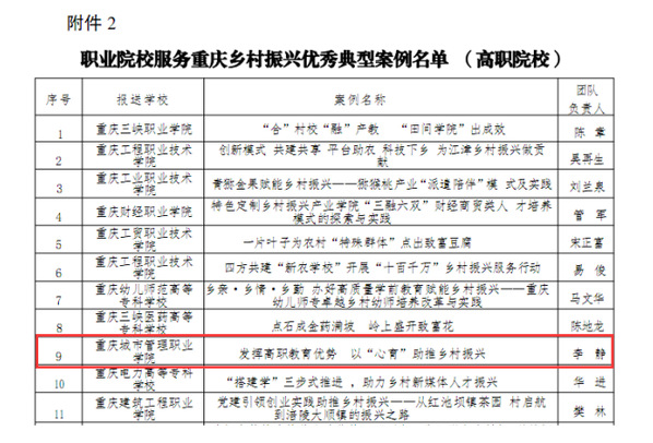 近日,重庆市职业教育学会、重庆市高等教育学会组织了职业院校服务重庆乡村振兴典型案例征集活动,经学校申报、专家线上评审和重庆市职业教育学会、重庆市高等教育学会联席会议复核,我校数智财经学院李静老师的《发挥高职教育优势 以“心育”助推乡村振兴》案例获评优秀典型案例。