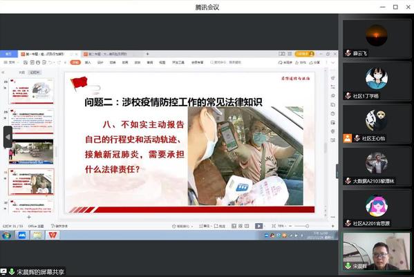 讲座以疫情期间大学生防控疫情为主线,主要围绕新冠肺炎疫情在国内的发展态势、涉校疫情防控工作的常见法律知识以及妨害疫情防控违法犯罪的法律适用三个部分展开,生动详实的回答了违规组织、举办或参加聚会,或拒不配合封控管理擅自外出、聚集;拒不配合佩戴口罩、接受核酸检测、开展的疫情流行病学调查等疫情排查防控工作等10个问题。同时,从公安机关涉疫管控的法定职责、依法打击妨害疫情防控违法犯罪的法律适用阐述了如何规范自身行为。讲座后,宋晨辉老师还与广大同学进行了线上互动交流,通过交流答疑,进一步帮助大家深刻认识疫情期间违反法律法规对学习和生活带来的影响。