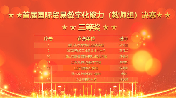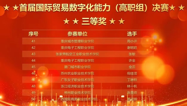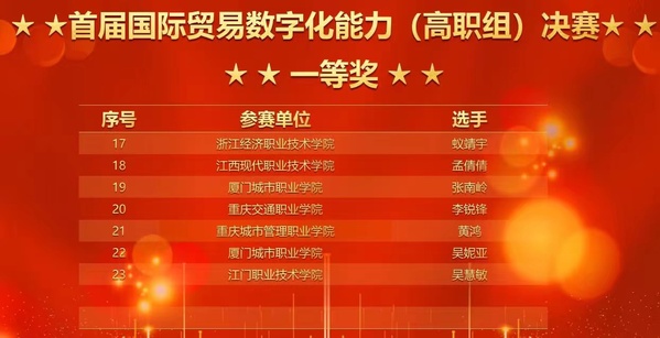 首届国际贸易数字化能力大赛自今年5月开启报名,参与初赛共1132支队伍,我校6名选手均以选拔赛一等奖的成绩顺利入围11月25-27日的总决赛。经过300分钟,4个模块的综合比拼,商学院关务与外贸服务专业黄鸿获得决赛一等奖,郭孟然、黄籍莹获得二等奖,国际经济与贸易专业丁小萍获得三等奖,商学院唐斌教授获得教师组三等奖。