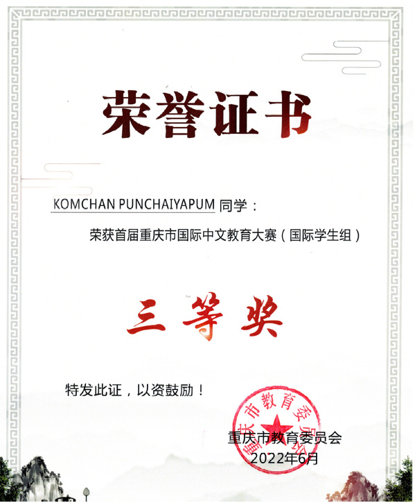 为推进国际中文教育事业发展,展现重庆市高校有志于从事国际中文教育事业的中国学生和国际学生的良好风采,5月,重庆市首届重庆市国际中文教育大赛在重庆师范大学举办。据重庆市教委公布的大赛获奖名单(渝教外发〔2022〕6号),我校国际学生KOMCHAN PUNCHAIYAPUM荣获不在渝国际学生组三等奖,学校作为唯一一所高职院校荣获优秀组织奖。