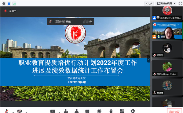 为深入贯彻落实教育部等九部门印发的《职业教育提质培优行动计划(2020—2023年)》,高质量推进职业教育提质培优行动,12月5日,我校在线上召开职业教育提质培优行动计划2022年度工作进展暨绩效数据统计工作布置会。“提质培优”行动计划子项目负责人和联络员、双高建设办公室工作人员参加会议,会议由双高办常务副主任黄蘋主持。