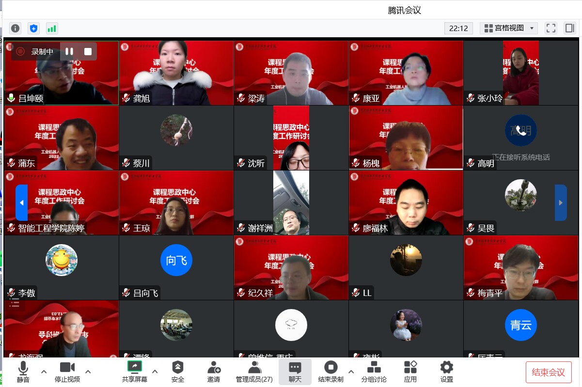 为深入学习宣传贯彻党的二十大精神,进一步提高教师课程思政建设和应用能力,促进课程思政建设经验交流与推广,12月4日,智能工程学院工业机器人技术专业群课程思政中心召开2022年工作总结暨交流研讨会。会议由智能工程学院副院长吕坤颐主持。大数据与信息产业学院副院长梅青平受邀参加。工业机器人技术专业群全体教师参加了此次研讨会。