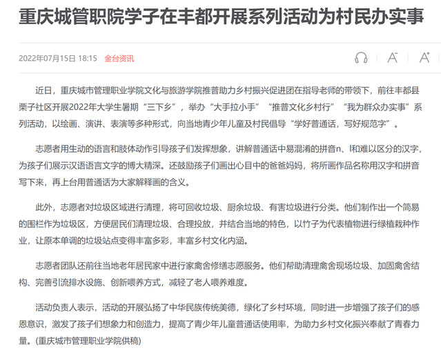 作者:文化与旅游学院审核发布:重庆城市管理职业学院发布者:党委宣传网工部发布时间:2022-07-15浏览次数:73