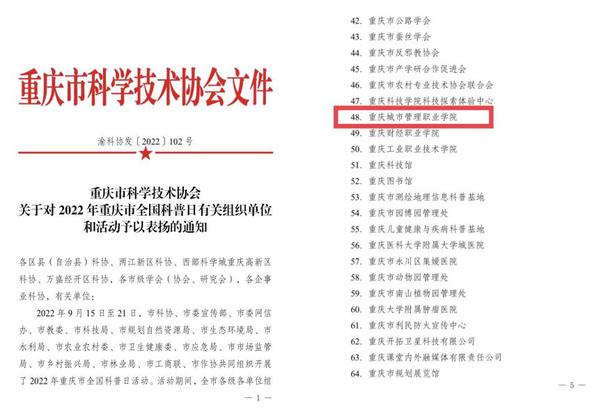 近日,重庆市科学技术协会公布了《关于对2022年重庆市全国科普日有关组织单位和活动予以表扬的通知》(渝科协发〔2022〕102号),我校被评为2022年重庆市全国科普日活动优秀组织单位。