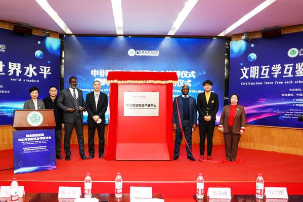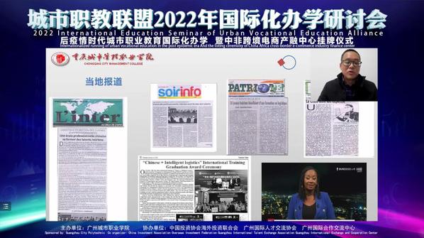 在论坛开幕式上,广州城市职业学院李艳娥校长致欢迎辞并就城市职教联盟发展现状进行了介绍,当前全国以“城市”命名的院校有20多所,目前已有16所院校加入了联盟,城市职教联盟将遵循“以联盟为平台,以项目为纽带,加快人才培养,服务区域社会经济发展”的理念,打造“城市”职业院校共享资源 、共谋发展、共赢未来的长久平台。接下来广东省教育厅交流合作处四级调研员周柳余、广州市教育局高教处二级调研员方昌明、喀麦隆驻华大使馆副大使Defang Eugin等进行线上线下讲话,希望联盟平台继续深化“一带一路”建设,服务国家产能合作。会上还举行了中非跨境电商产融中心揭牌仪式。