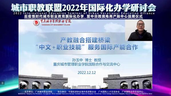 12月12日,由广州城市职业学院主办、以“后疫情时代城市职业教育国际化办学”为主题的城市职教联盟国际化办学论坛在该校广园南校区顺利召开。国际合作与交流中心主任孙玉中作为联盟院校代表应邀线上参会并作报告。